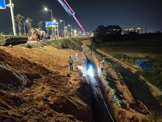 項目施工工期僅為6個月,工期十分緊張,公司項目部充分發揮“鐵軍精神”,科學組織施工,實施“黨建+”模式,成立“黨員突擊隊”和“青年突擊隊”,推進黨建工作和項目施工深度融合,將黨建優勢轉化為現實生產力,僅用55個晝夜就完成了關鍵節點任務。因此,這項工程也被項目部上下稱為“星光工程”,他們用焊花作星、以混凝土為墨,在夜色中打造了一條提升日供水能力達2萬立方米的城市主動脈。
