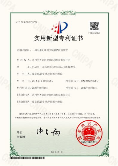 繼連續斬獲四項污水、污泥處理相關技術專利后,惠州水務集團碧源公司在水務環保技術創新領域再傳捷報。8月19日,由碧源公司自主研發的“一種污水處理用次氯酸鈉投放裝置”榮獲國家知識產權局授予專利權并頒發實用新型專利證書。至此,公司已在水務環保領域累計斬獲五項國家授權專利,涵蓋污水、污泥處理等多個關鍵技術環節。